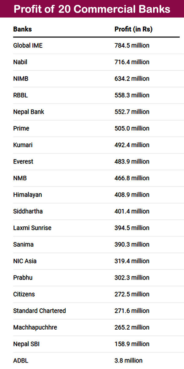 According to the Nepal Rastra Bank (NRB), commercial banks alone posted a net profit of Rs 8.38 billion in Shrawan (mid-July to mid-August), or 89.33% of the total net profit of BFIs, in the review period.