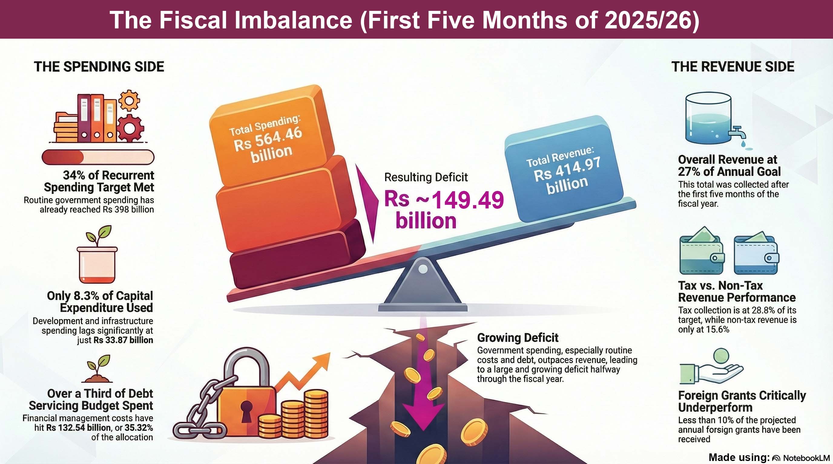 KATHMANDU: Nepal’s fiscal deposit climbed to Rs 149.49 billion over the first five months of the current fiscal year, highlighting a widening gap between government spending and revenue.