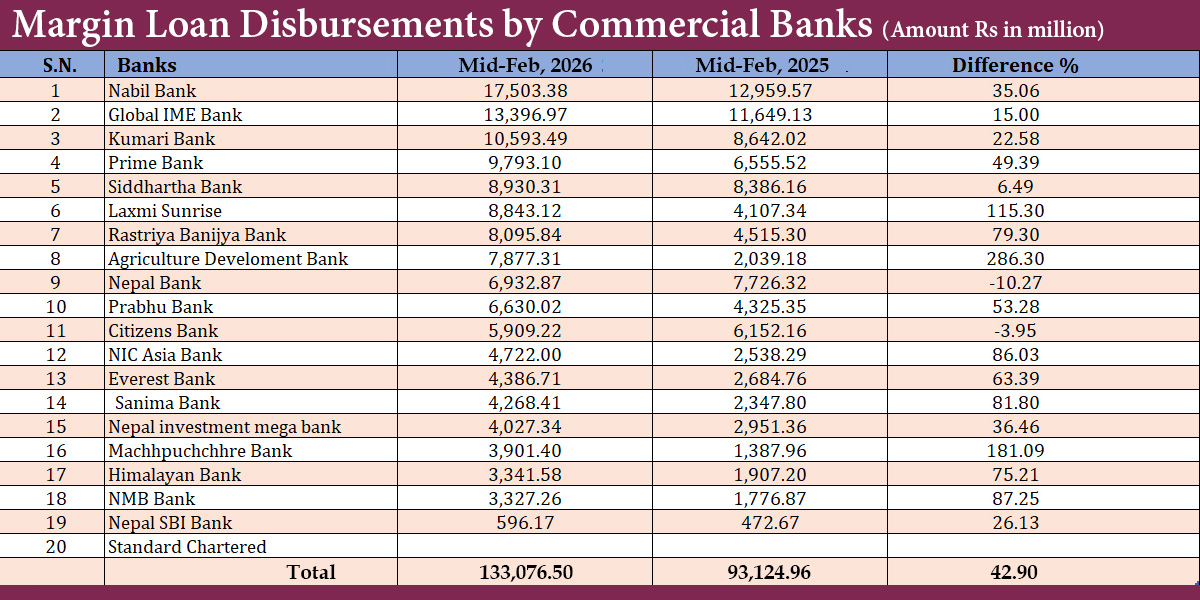 According to data released by Nepal Rastra Bank (NRB), commercial banks disbursed a total of Rs 133.07 billion in margin-type loans between mid-July 2025 and mid-February 2026 of the fiscal year 2025/26. This marks a 42.9% increase compared to the same period last fiscal year, when such lending stood at Rs 93.12 billion.