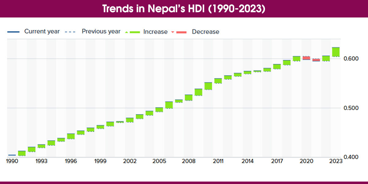 Between 2022 and 2023, Nepal’s HDI value rose from 0.605 to 0.622, moving the country up from 146th to 145th position. This improvement reflects positive developments in key human development indicators.