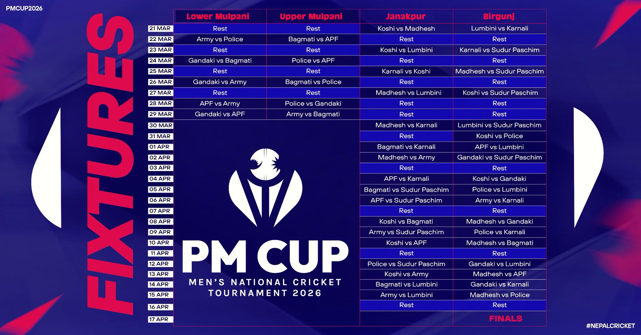 The tournament features seven provincial sides alongside three departmental teams—Tribhuvan Army Club (TAC), Nepal Police Club (NPC), and Nepal Armed Police Force Club (APF).