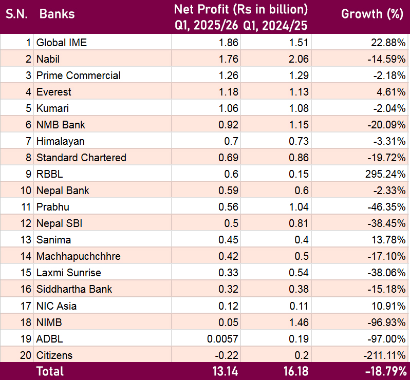 KATHMANDU: Total net profit of commercial banks fell 18.61% to Rs 13.14 billion in the first quarter of the fiscal year 2025/26.