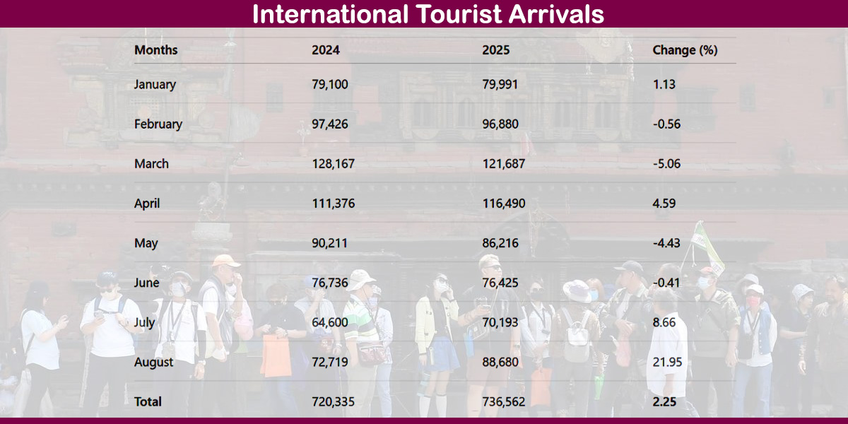 A total of 736,562 international tourists visited Nepal between January and August this year, up from 720,335 during the same period in 2024. The growth was largely driven by a strong performance in August, when Nepal welcomed 88,680 visitors – a 21.95% growth compared to arrivals recorded in August last year.