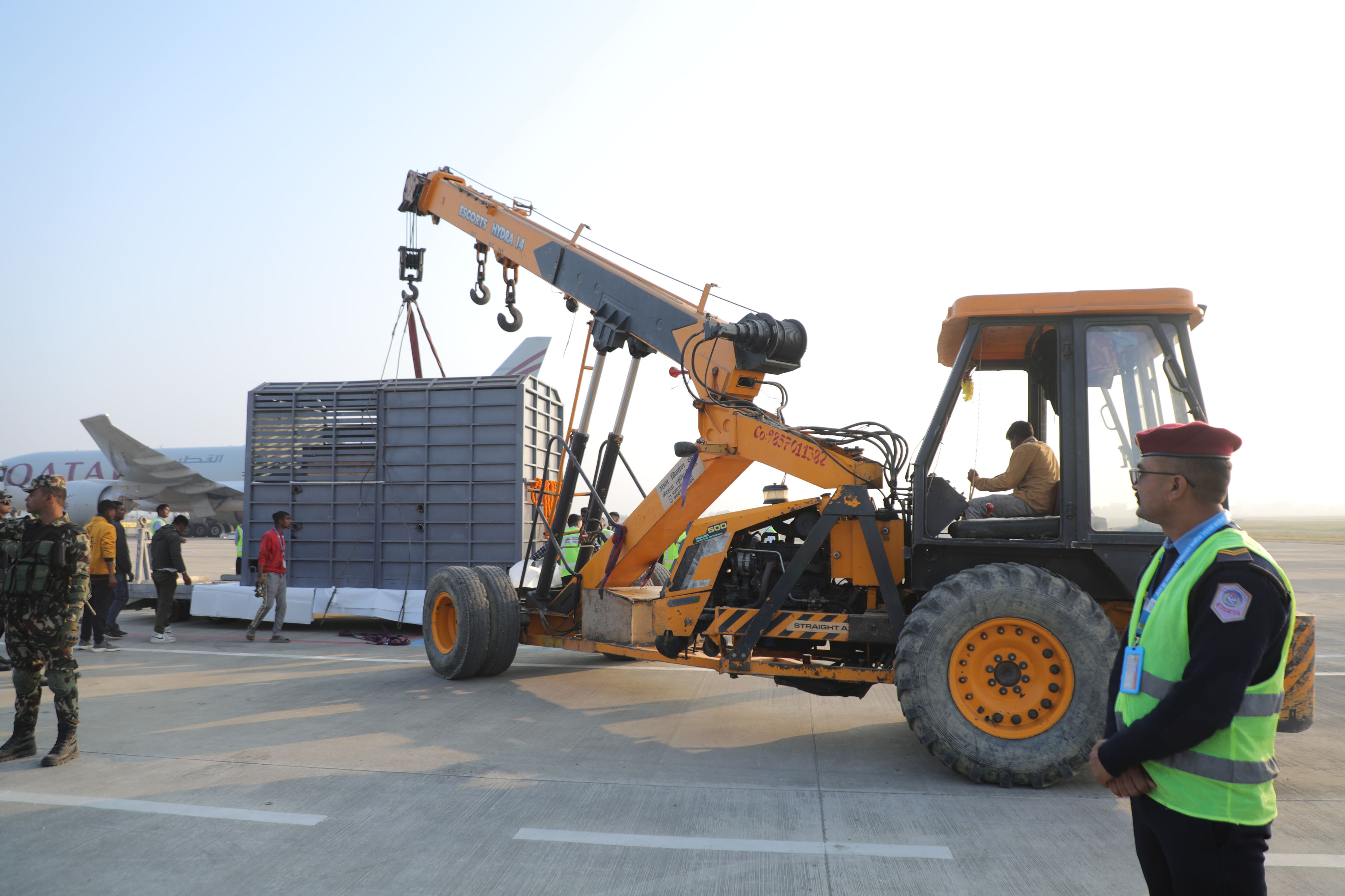 A Boeing 777F freighter departed from the airport with a cargo containing two elephants – Khagendra Prasad and Rudrakali – on Wednesday evening, according to Binod Raut, the spokesperson for the Gautam Buddha International Airport.